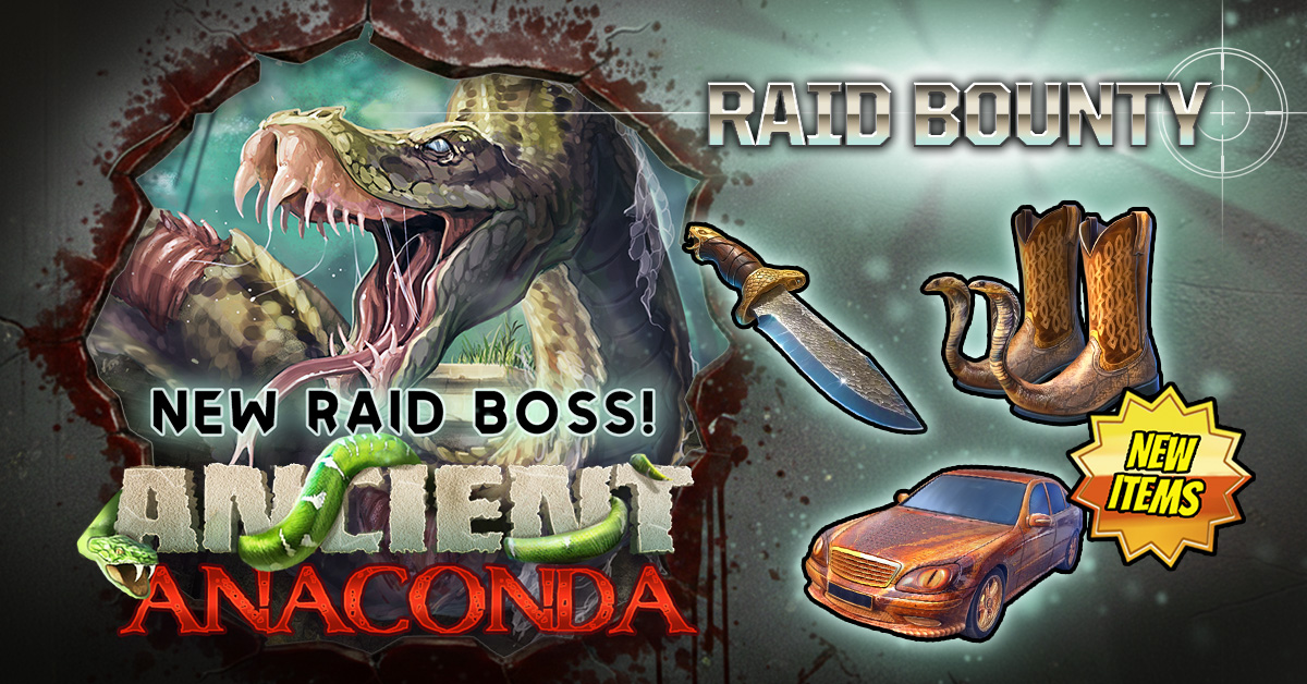 Raid Bounties have returned! As you battle the Ancient Anaconda Raid Boss you’ll be working towards the completion of various bounties. Complete them, collect the reward and work your way up to the Premium item rewards! Plus we have an event leaderboard where bonus rewards will be awarded at the end. If you need a refresher on the event, check out our FAQ here - https://support.kanoplay.com/hc/en/7-zombie-slayer/faq/600-raid-bounties/